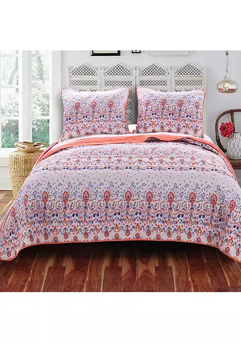 Tangerine fuchsia blue and gold paint a glimmering garden scene against an alabaster ground. Sure to captivate your imagination this bedding set brightens your room with unique charm. Reverses to a coordinating solid color. Full/Queen 90×90 with 2 Shams 20×26 – Multi. Oversized for better coverage on today’s deeper mattresses. Machine quilted for durability and surface interest. Reverses to a solid color coral. 100% Microfiber polyester face and back; Fill is 60% cotton, 40% polyester. Machine washable